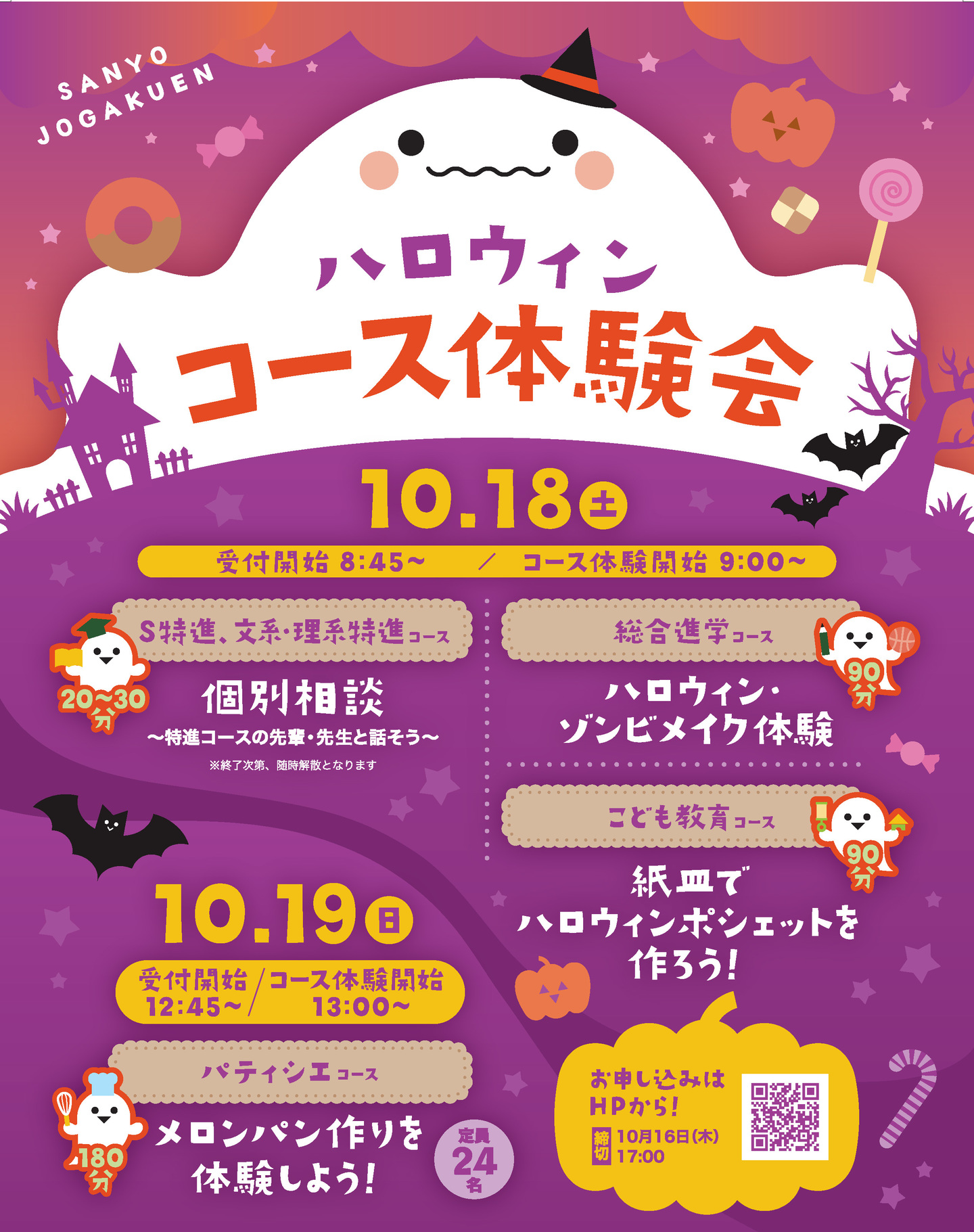 各コースご参加いただくには、ホームページの入力フォームより事前のお申し込みが必要です。 ※ご参加当日は上履きと靴袋を持参してください。※パティシエコース参加の方は、エプロン・三角巾をご準備ください。※午前6時に広島市または廿日市市で「暴風警報」「特別警報」が発令されている場合、 または警報が2つ以上発令されている場合は中止といたします。