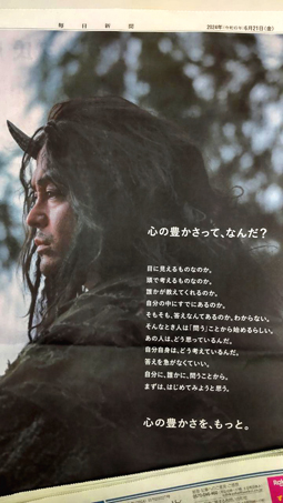 「NIE(教育に新聞を)」に協力してくださる各新聞社に感謝しながら、複数の新聞に目を通すのが、毎日の楽しみの一つになっています。今日の新聞に、一面全部を使った印象的な広告がありました。「鬼」が心の豊かさを問うという設定。「人間」は心ゆたかなの?と問われているのかもしれませんね。