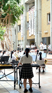 吹奏楽マーチング部は、中等部の生徒も数名活動しています。8/10、広島県吹奏楽コンクール高等学校A部門に高等部生徒と一緒に出場します。昨年までは小編成部門での出場でしたが、A部門は初出場です。そして本日昼休憩に、コンクールで演奏する2曲をアトリウムで発表してくれました。吹奏楽部の一生懸命さが伝わる、とてもいい演奏でした。本番でも練習の成果が出せるよう、悔いのない演奏ができますように。