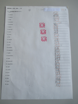 3年生の英語では毎週英単語テストを実施しています。語彙力を高めるために教科書で学ぶ単語に加え、2000語も入った単語帳を使っています。毎回50個ずつ、日本語の意味を書きます。満点を取るのは至難の業。写真は先週100点をとった生徒のものです。”たいへんよくできました!”の、はんこ3つです。