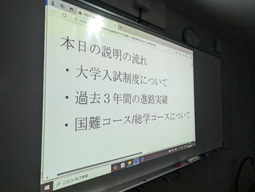 2年生特進コースを対象に、次年度の授業コースについて説明会を行いました。3年生では、志望校合格をより確実なものにするために、進路に応じた科目履修を選択することができます。これを機会に自分の将来について深く考えて欲しいと思います。