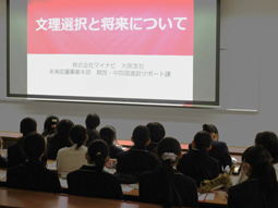 高等部1年生は次年度の授業選択に悩んでいる時期です。選択する際の参考となるように、株式会社マイナビ様より講師をお迎えして、文系・理系それぞれの学びの違いや職業等について説明していただきました。講演でも強調されていたように、目先のことだけにとらわれず、将来を見据えた選択をするよう期待しています。