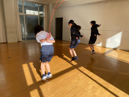 体育の授業で、持久走と縄跳びをしています。雪が降る中、校舎周り5周を走りました。縄跳びでは、3人が背面交差跳びにチャレンジしていました。見事3回ずつ跳んで合格!!!とても器用な3人でした!