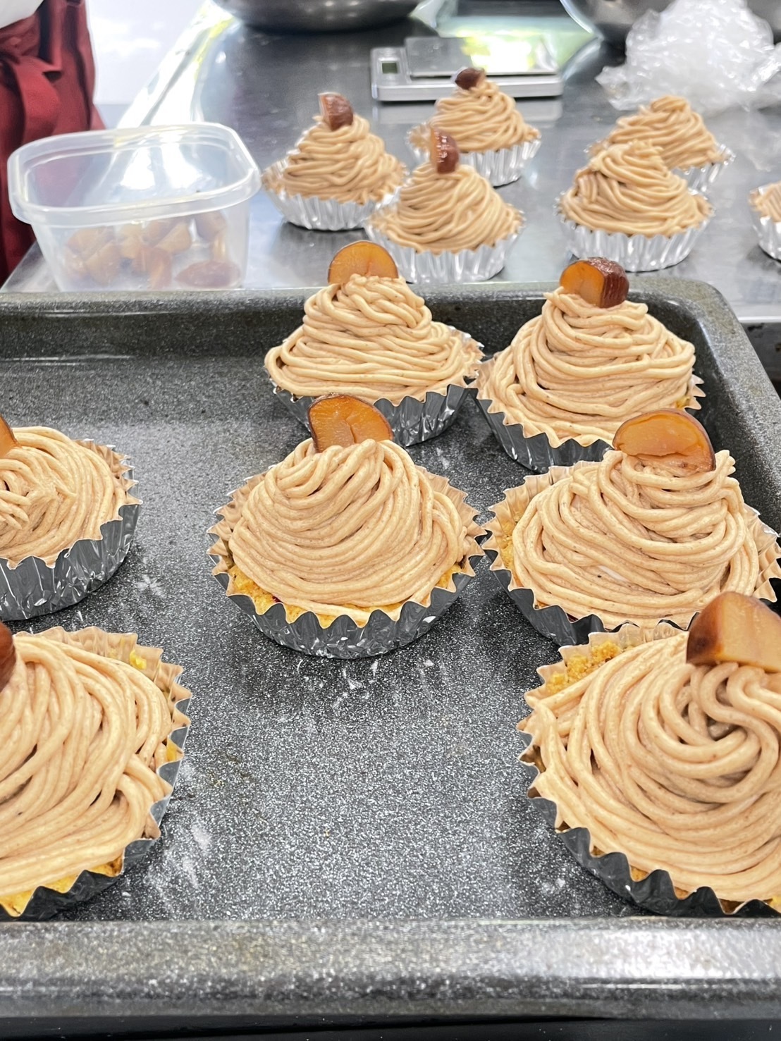 1年生のパティシエコースは本日「プロフェッショナル講座」でした。広島酔心調理専門学校の先生を講師に迎え、モンブランに挑戦しました。生徒に聞くと、マロンクリームを絞るのが難しかったそうです。苦労した甲斐あって、とても美味しそうにできました!