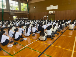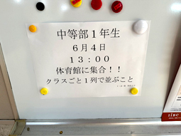 1年生は今週の金曜日から2泊3日で、国立山口徳地青少年自然の家へ研修に行きます。この研修では様々なことを学びぶとともに、「10分前行動、5分前集合」の大切さを身につけます。今日は、その練習として学校の体育館に集合してみました。集合時間の掲示をきちんと見て、みんなで声をかけながら時間通りに集合することができました。実際の研修でもしっかりと時間が守れるようにしてほしいと思います。