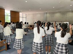 中等部では毎週水曜日に個性輝きという授業を行っています。中等部2年生は、マルチメディアコースとミュージカルコースの2つに分かれて活動をしています。この写真はミュージカルコースの様子です。今日は学習発表会で披露する劇の練習を行っていました。講師の先生方の話を聞き、楽しみながら劇中にあるダンスの練習をしていました。どんな作品が出来るか非常に楽しみです。