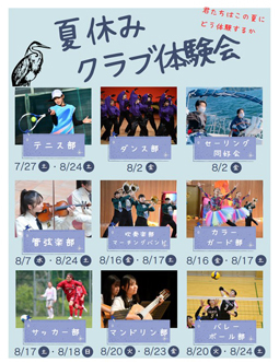 夏休みクラブ体験会の申込みが6月12日(水)から始まります。今年は9つのクラブ・同好会から体験することができます。気になるクラブ・同好会があれば、ぜひ参加してみてください。複数日程の参加も可能です。詳細は