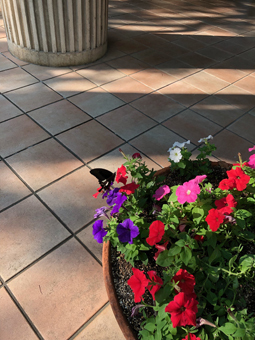いつも校舎の玄関前を飾ってくれているフラワーポットに大きな蝶がとまっていました。美しい羽を羽ばたかせながら花の蜜を吸っています。バタバタと忙しい日々が続き、草花に目を向ける余裕がなかったのですが、今日は一羽の蝶が声をかけてくれたようでした。