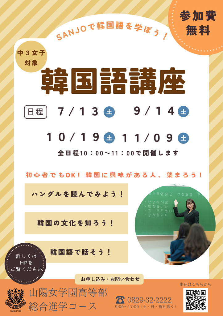 総合進学コース1年生は総合探求の時間に韓国語を学んでいます。中学3年生女子を対象に本校オリジナルの「韓国語講座」も開講しています。初心者でも大丈夫ですので、是非ご参加お待ちしております。