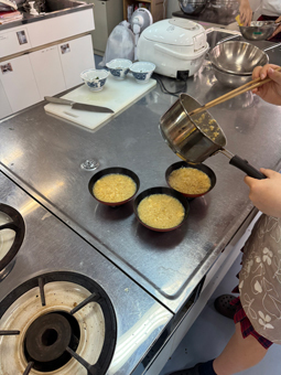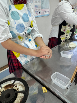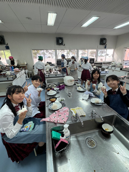 調理室から良い香りが漂ってきたので、思わず覗いてみると、中等部1年生が家庭科の授業で調理実習を行っていました。メニューはおにぎり、かき玉汁、ほうれん草の胡麻和えです。頑張って作ったおにぎりを満足そうに大きな口で食べる姿がとても印象に残りました。実習で学んだことを、これからの家庭生活に活かしてほしいと思います。