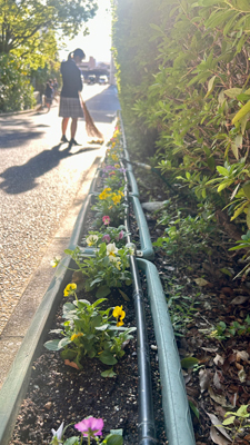 本校の正門から校舎へと続く「夢咲き坂」は、100を超えるプランターで季節の花を咲かせています。