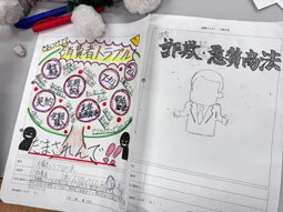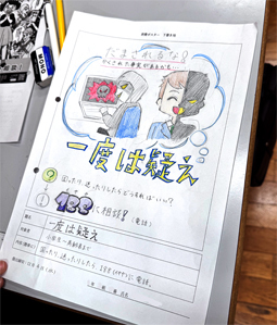 1年生の家庭科の授業の様子です。これまで消費生活で学んできたことを社会に発信しようということで、現在ポスター作りに取り組んでいるそうです。それぞれ異なるテーマで、各自工夫を凝らした作品を仕上げていました。